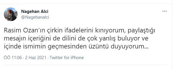 Sosyal medya hesabından Kütahyalı'nın sözlerine yanıt veren Alçı, ''Rasim Ozan’ın çirkin ifadelerini kınıyorum, paylaştığı mesajın içeriğini de dilini de çok yanlış buluyor ve içinde ismimin geçmesinden üzüntü duyuyorum'' dedi.