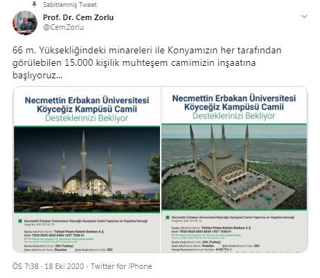 Aynı zamanda eski AKP Konya Milletvekili olan Cem Zorlu, sosyal medya hesabından yaptığı paylaşımda IBAN hesabı verip "66 m. Yüksekliğindeki minareleri ile Konyamızın her tarafından görülebilen 15.000 kişilik muhteşem camimizin inşaatına başlıyoruz..." ifadelerini kullandı.