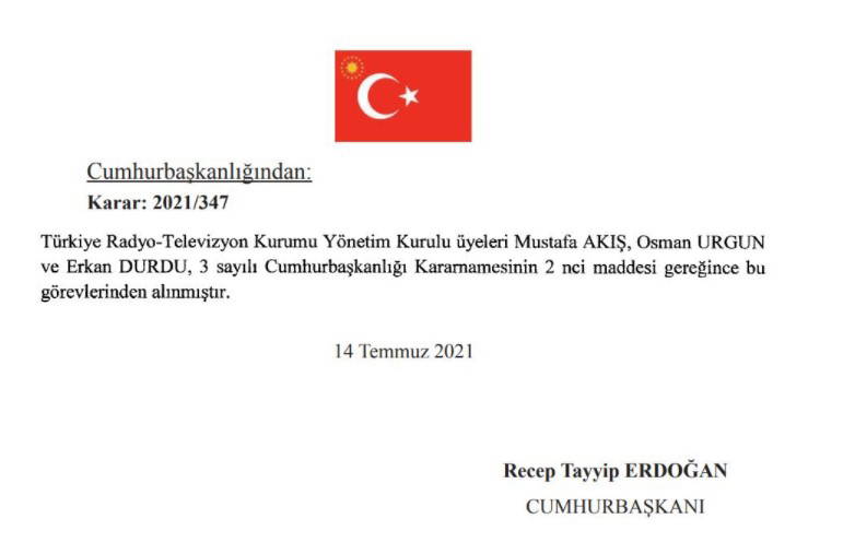 347 numaralı atama kararında Türkiye Radyo-Televizyon Kurumu Yönetim Kurulu üyeleri Mustafa Akış, Osman Urgun ve Erkan Durdu, 3 sayılı Cumhurbaşkanlığı Kararnamesinin 2’nci maddesi gereğince bu görevlerinden alınmıştır” ifadesi yer aldı.