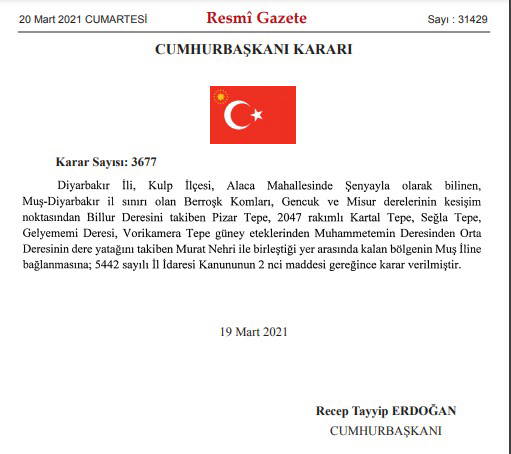 “Diyarbakır ili, Kulp ilçesi, Alaca Mahallesi’nde Şenyayla olarak bilinen, Muş-Diyarbakır il sınırı olan Berroşk Komları, Gencuk ve Misur derelerinin kesişim noktasından Billur Deresi’ni takiben Pizar Tepe, 2047 rakımlı Kartal Tepe, Seğla Tepe, Gelyememi Deresi, Vorikamera Tepe güney eteklerinden Muhammetemin Deresi’nden Orta Deresi’nin dere yatağını takiben Murat Nehri ile birleştiği yer arasında kalan bölgenin Muş iline bağlanmasına 5442 sayılı İl İdaresi Kanununun 2'nci maddesi gereğince karar verilmiştir.”