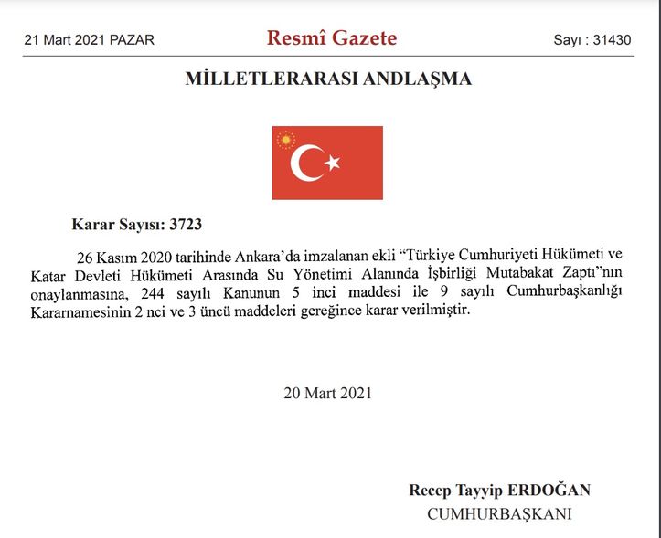 AKP'li Cumhurbaşkanı Recep Tayyip Erdoğan imzasıyla yayımlanan 21 Mart 2021 tarihli kararda "26 Kasım 2020 tarihinde Ankara'da imzalanan ekli "Türkiye Cumhuriyeti Hükümeti ve Katar Devleti Hükümeti Arasında Su Yönetimi Alanında İşbirliği Mutabakat Zaptı'nın onaylanmasına, 244 sayılı Kanunun 5'inci maddesi ve 9 sayılı Cumhurbaşkanlığı Kararnamesinin 2'inci ve 3'üncü maddeleri gereğince karar verilmiştir" ifadeleri yer aldı.