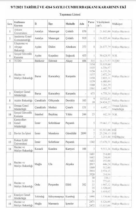 Ekli listede yer alan taşınmazların ve üzerlerinde bulunan yapıların (varlıkların);