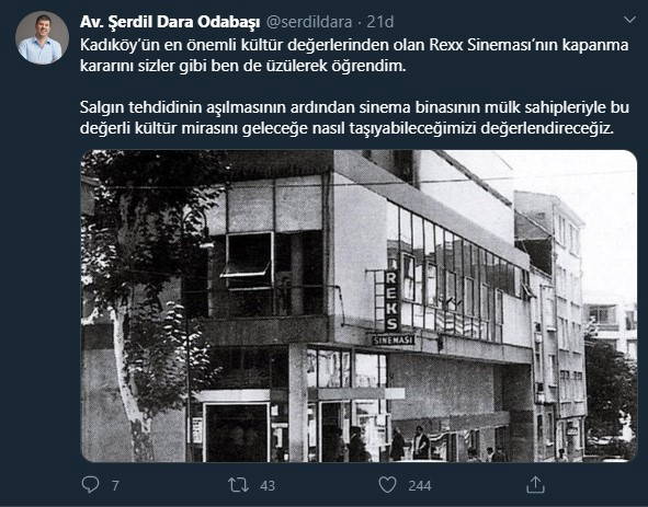 "Kadıköy’ün en önemli kültür değerlerinden olan Rexx Sineması’nın kapanma kararını sizler gibi ben de üzülerek öğrendim.