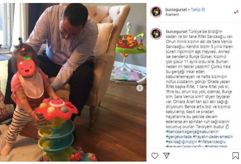 Bu iddialardan sonra, yaklaşık dört yıl önce tüp bebek yöntemi ile kızı Sera Venüs’ü kucağına alan, babasının da Rifat Sarıcaoğlu olduğunu söyleyen Gürsel, tepkiler karşısında açıklama yapmış ve “Türkiye’de bildiğim bir tane Rifat Sarıcaoğlu var. Onun minik kızının adı da Sera Venüs Sarıcaoğlu. Kendisi bizim 5 yıllık halen süren ilişkimizin aşk meyvesi. Bu gerçeği hala inkar eden, kabullenmeyen ve hatta kızımızın nüfus cüzdanını görüp ‘Orada yazan Rifat başka Rifat, 1 tane Rifat yok ki, iftira bu, onun kızı yok, olamaz’ diyen teyzeler var” diyerek ilişkilerinin doğru olduğunu, birlikte çekilmiş fotoğraflarını paylaşarak göstermiş oldu…