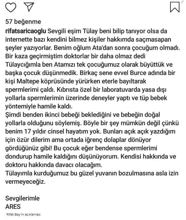 “Sevgili eşim Tülay beni bilip tanıyor” diye başlayan açıklama şöyle devam ediyor: “İnternette bazı kendini bilmez kişiler hakkımda saçma sapan şeyler yazıyorlar. Benim oğlum Ata’dan sonra çocuğum olmadı. Bir kaza geçirmiştim doktorlar bir daha olmaz dedi… Tülaycığımla ben Ata’mızı tek çocuğumuz olarak büyüttük ve başka çocuk düşünmedik. Birkaç sene evvel Burçe adında bir kişi Maltepe köprüsünde yürürken eterle bayıltarak spermlerimi çaldı. Kıbrıs’ta özel bir laboratuvarda yasadışı yollarla spermlerimin üzerinde deneyler yaptı ve tüp bebek yöntemiyle hamile kaldı. Şimdi benden ikinci bebeği beklediğini ve bebeğin doğal yollarla olduğunu söylemiş. Böyle bir şey mümkün değil çünkü benim 17 yıldır cinsel hayatım yok. Bunları açık açık yazdığım için özür dilerim ama ortada iğrenç dolaplar dönüyor gördüğünüz gibi! Bu çocuk eğer benden ise spermlerimi dondurup hamile kaldığını düşünüyorum. Kendisi hakkında ve doktoru hakkında davacı olacağım. Tülay’ımla kurduğumuz bu güzel yuvanın bozulmasına asla izin vermeyeceğiz.”