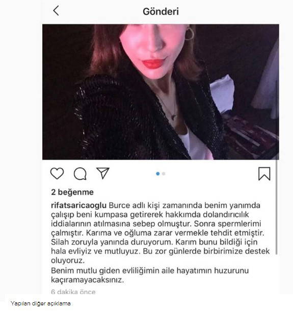 Bu yazı sonrasında hesaptan yeniden bir paylaşım yapıldı. Bu kez Burçe’nin, Sarıcaoğlu’nu ve ailesini tehdit ettiği yazıldı. Hatta Rifat Bey silah zoruyla evde tutulduğunu yazdı… Bu paylaşımları yapanın Rifat Bey’in eşi Tülay Hanım olduğu, hesabı kendisinin yönettiği yönünde iddialar ortaya atıldı.