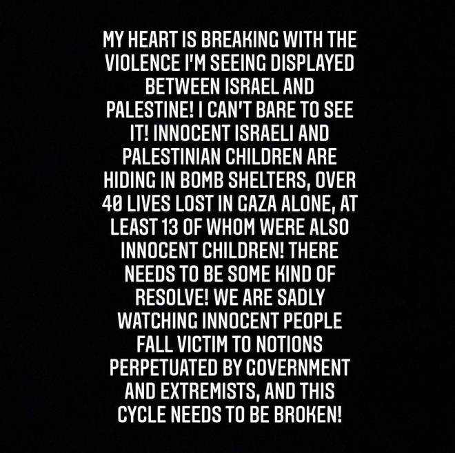 "İsrail ile Filistin arasında gördüğüm şiddetten dolayı kalbim kırılıyor! Olanlara bakmaya dayanamıyorum! Masum İsrailli ve Filistinli çocuklar bomba barınaklarında saklanıyor, sadece Gazze'de 40'tan fazla hayat kaybediliyor, bunlardan en az 13'ü masum çocuktu!"