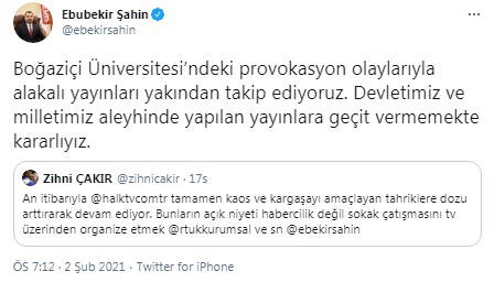İktidara yakın AvazTurk'un Genel Yayın Yönetmeni Zihni Çakır'ın Halk TV'yi hedef alarak, "Bunların açık niyeti habercilik değil sokak çatışmasını TV üzerinden organize etmek" paylaşımına yanıt veren Şahin, "Boğaziçi Üniversitesi’ndeki provokasyon olaylarıyla alakalı yayınları yakından takip ediyoruz" dedi.
