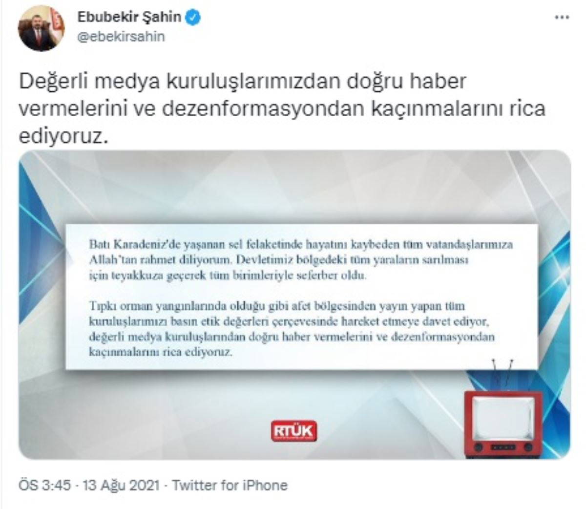 RTÜK Başkanı Ebubekir Şahin, sosyal medya hesabından yaptığı açıklamada şu ifadeleri kullandı.