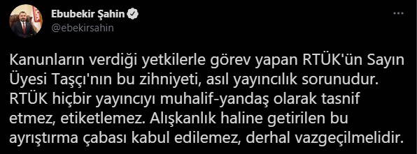 Taşçı'nın gündeme getirdiği açıklamaya sosyal medyadan yanıt veren RTÜK Başkanı Ebubekir Şahin, sosyal medyadan Taçcı'ya "Kanunların verdiği yetkilerle görev yapan RTÜK'ün Sayın Üyesi Taşçı'nın bu zihniyeti, asıl yayıncılık sorunudur. RTÜK hiçbir yayıncıyı muhalif-yandaş olarak tasnif etmez, etiketlemez. Alışkanlık haline getirilen bu ayrıştırma çabası kabul edilemez, derhal vazgeçilmelidir" yanıtını verdi.