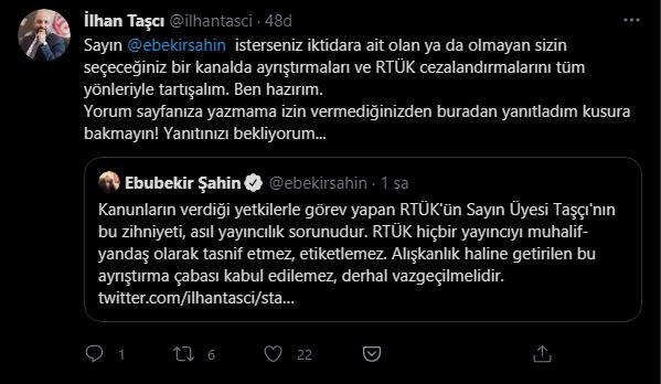 "Sayın @ebekirsahin isterseniz iktidara ait olan ya da olmayan sizin seçeceğiniz bir kanalda ayrıştırmaları ve RTÜK cezalandırmalarını tüm yönleriyle tartışalım. Ben hazırım. Yorum sayfanıza yazmama izin vermediğinizden buradan yanıtladım kusura bakmayın! Yanıtınızı bekliyorum..."
