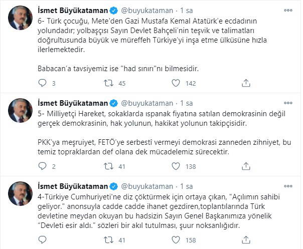 Resmi sosyal medya hesabından açıklamalarda bulunan Büyükataman, bu kez Ali Babacan’ı hedef aldı. Ali Bababcan’ın MHP Genel Başkanı Devlet Bahçeli için RTÜK’ten 18 yaş sınırı istemesine sert sözlerle tepki gösteren MHP’li Büyükataman, “Babacan’a tavsiyemiz ise "had sınırı"nı bilmesidir” dedi. Babacan’ın, Bahçeli’ye yönelik, “Devleti esir aldı” şeklindeki ifadelerine de tepki gösteren Büyükataman, “Bir akıl tutulması, şuur noksanlığıdır” dedi.