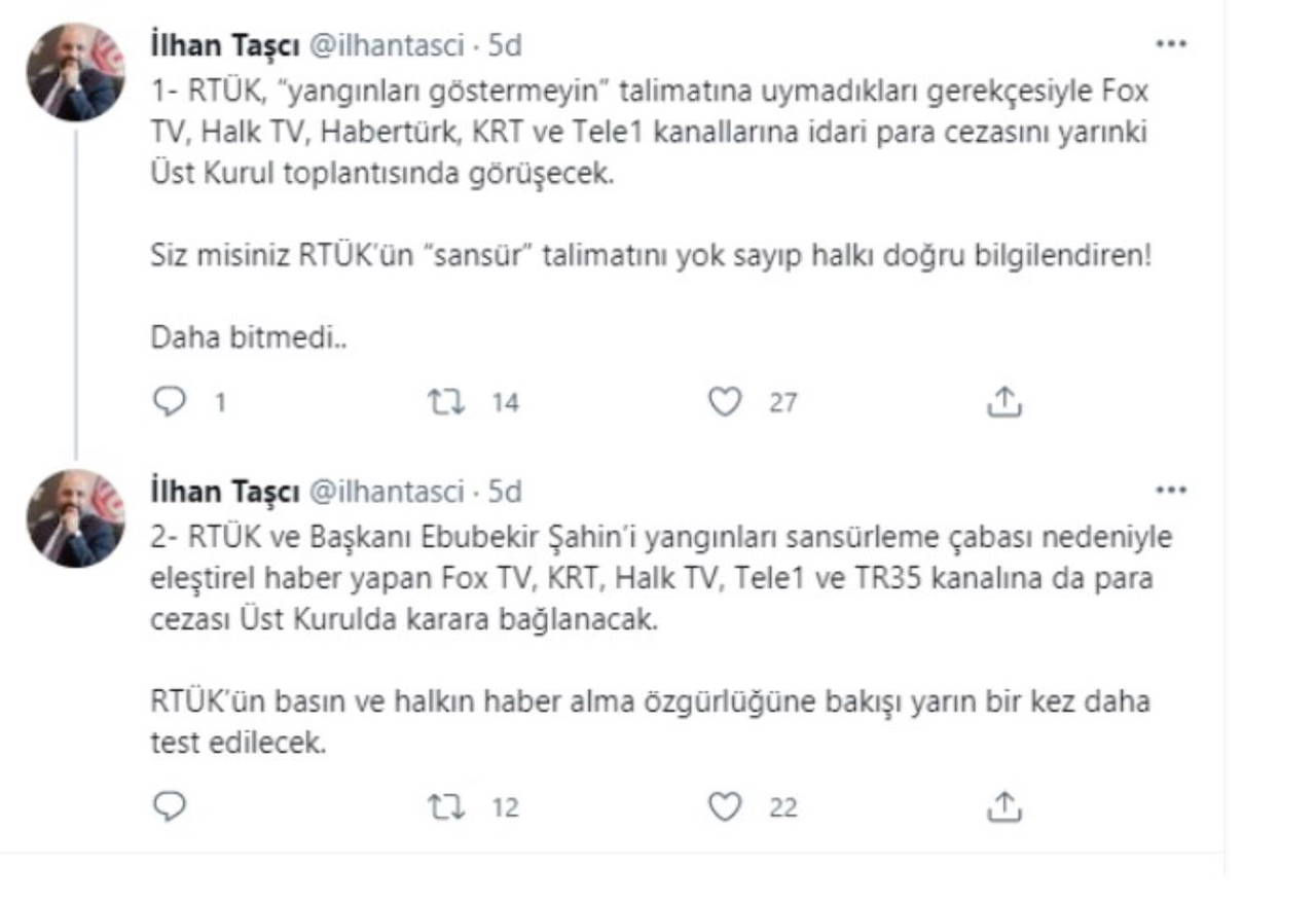 RTÜK ve Başkanı Ebubekir Şahin’i yangınları sansürleme çabası nedeniyle eleştirel haber yapan Fox TV, KRT, Halk TV, Tele1 ve TR35 kanalına da para cezası Üst Kurulda karara bağlanacak. RTÜK’ün basın ve halkın haber alma özgürlüğüne bakışı yarın bir kez daha test edilecek.