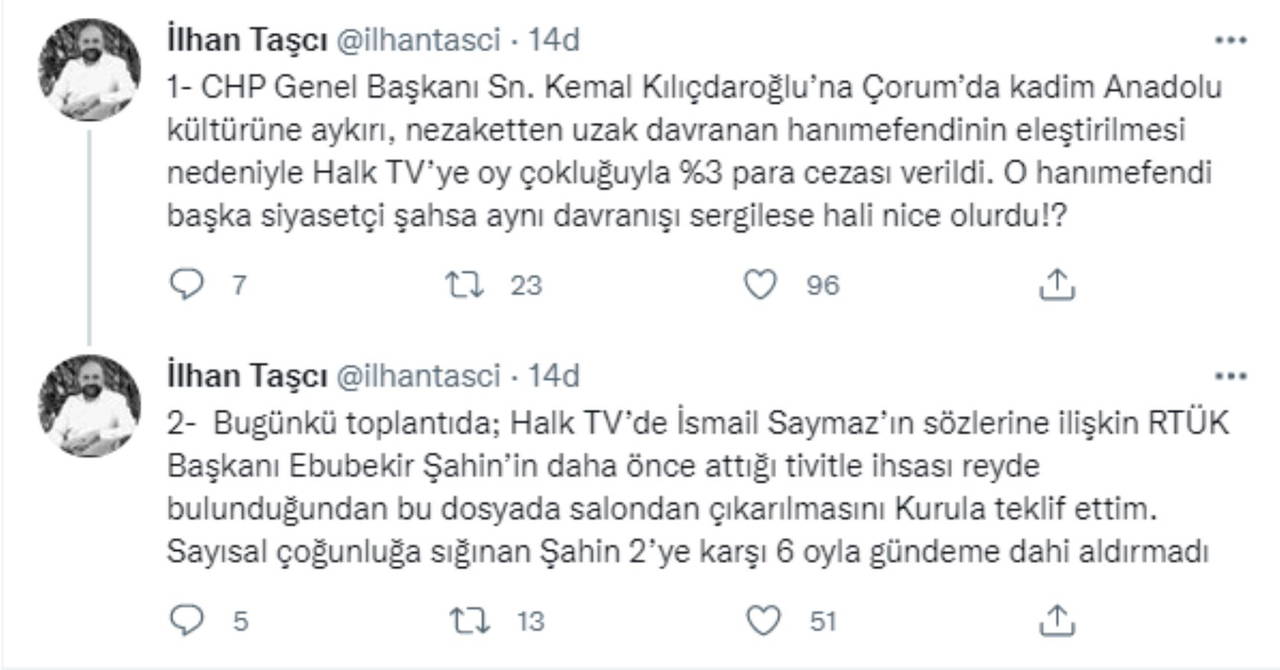 RTÜK'ün verdiği cezayı CHP'li RTÜK üyesi İlhan Taşçı Twitter hesabından duyurdu.