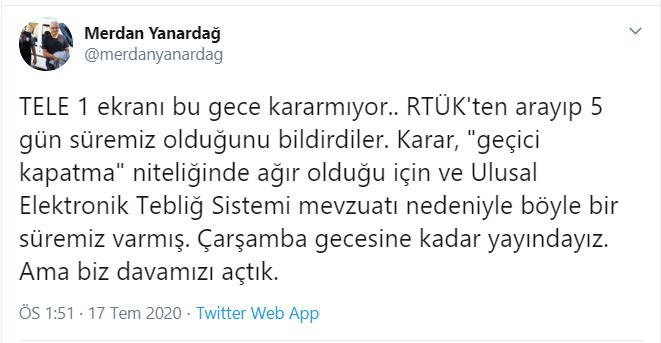 "TELE 1 ekranı bu gece kararmıyor.. RTÜK'ten arayıp 5 gün süremiz olduğunu bildirdiler. Karar, "geçici kapatma" niteliğinde ağır olduğu için ve Ulusal Elektronik Tebliğ Sistemi mevzuatı nedeniyle böyle bir süremiz varmış. Çarşamba gecesine kadar yayındayız. Ama biz davamızı açtık."