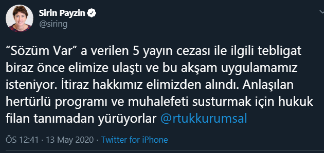 “Sözüm Var” a verilen 5 yayın cezası ile ilgili tebligat biraz önce elimize ulaştı ve bu akşam uygulamamız isteniyor. İtiraz hakkımız elimizden alındı. Anlaşılan hertürlü programı ve muhalefeti susturmak için hukuk filan tanımadan yürüyorlar"
