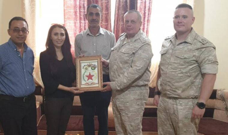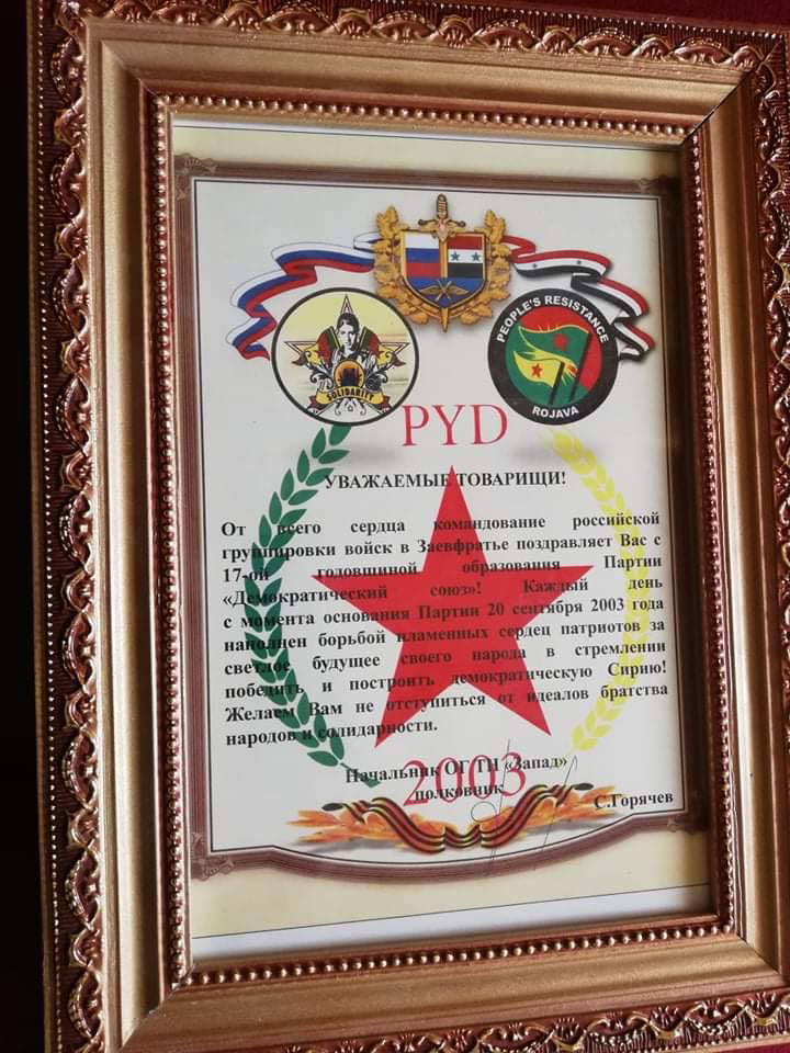 Suriye'de Rus ordusuna bağlı bir heyet Kobani şehrine giderek PYD'li teröristlere 'plaket' verdi.