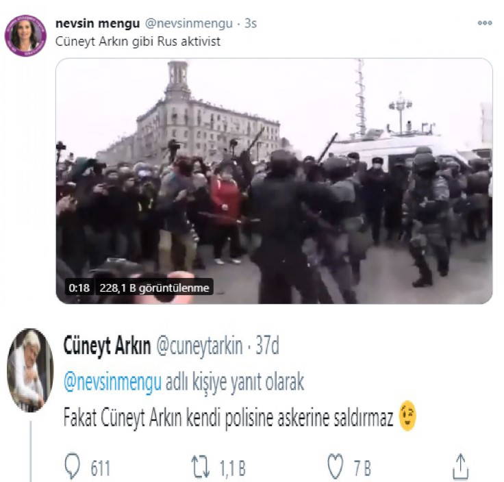 Gazeteci Nevşin Mengü, yaşanan protesto olaylarının görüntüsünü “Cüneyt Arkın gibi Rus aktivist” diyerek sosyal medya hesabından paylaştı. Nevşin Mengü’nün bu paylaşımına Cüneyt Arkın’dan yanıt geldi.