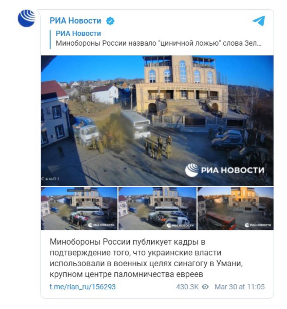 Konaşenkov, “Fotoğraflar, İsrail Parlamentosu’nda 20 Mart’ta Ukrayna Devlet Başkanı Vladimir Zelenskiy’in Rus ordusunun Uman şehrinde sinagogu vurduğuna dair yaptığı konuşmanın ertesi günü çekildi. Rus silahlı kuvvetleri dini yerleri vurmuyor. Kiev rejimi böyle yerleri silah toplama ve sevkiyat yeri olarak kullanıyor” ifadelerini kullandı.