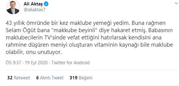 Aktaş, "43 yıllık ömründe bir kez maklube yemeği yedim. Buna rağmen Selman Öğüt bana 'makkube beyinli' diye hakaret etmiş. Babasının maklubecilerin TV'sinde vefat ettiğini hatırlarsak kendisini ana rahmine düşüren meniyi oluşturan vitaminin kaynağı bile maklube olabilir, onu unutuyor" dedi.