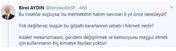 "İnatla 'adalete olan güven' sarsılmaya devam ediliyor. 6 yıl sonra ne değişti de, yargılanıp serbest kaldıkları dosyadan dolayı insanları sabahın erken saatlerinde evlerinden gözaltına alıyorsunuz? İktidar, muhalefeti kendi iç meselelerine meze yapmaktan artık vazgeçmelidir" dedi. Aydın, "Adalet mekanizmasını, gündem değiştirmek ve kamuoyunu meşgul etmek için kullanmanın hiç kimseye faydası yoktur" diyerek "Bir ülkede adalete olan güven ortadan kalktığı taktirde, o ülkede hiçbir iş yolunda gitmez. Bir kez daha uyarıyoruz, bu ülkenin böylesine keyfi ve hoyrat tavırlara değil, adalete olan güveni yeniden tesis edecek adımlara ihtiyacı var. İnsanımıza ve ülkemize yazık oluyor"