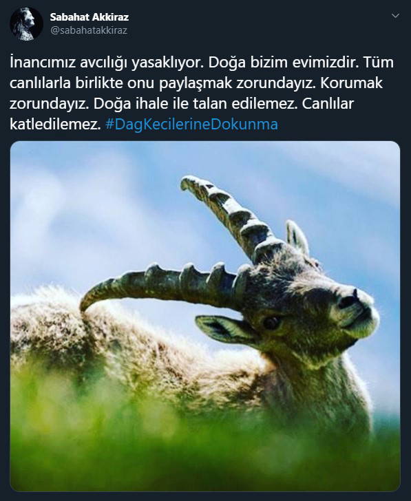 “İnancımız avcılığı yasaklıyor. Doğa bizim evimizdir. Tüm canlılarla birlikte onu paylaşmak zorundayız. Korumak zorundayız. Doğa ihale ile talan edilemez. Canlılar katledilemez. #DagKecilerineDokunma”