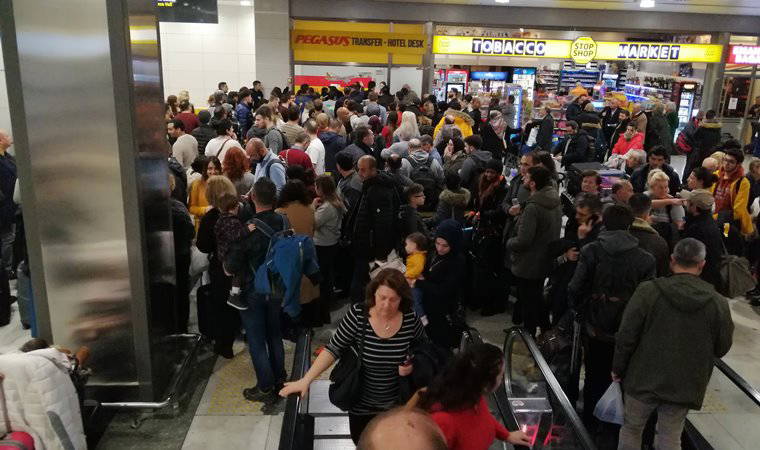 Seferleri iptal olan yolcular Sabiha Gökçen Havalimanında yoğunluğa neden oldu. Yolcular ıslıklarla durumu protesto etti.