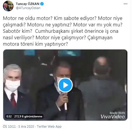 CHP İzmir Milletvekili Tuncay Özkan, sosyal medyada gündem olan o anların görüntülerini Twitter hesabından paylaşıp "Motor ne oldu motor? Kim sabote ediyor? Motor niye çalışmadı? Motoru ne yaptınız? Motor var mı yok mu? Sabotör kim? Cumhurbaşkanı şirket önerince iş ona nasıl veriliyor? Motor niye çalışmıyor? Çalışmayan motora töreni kim yaptırıyor?" sorularını yöneltti.