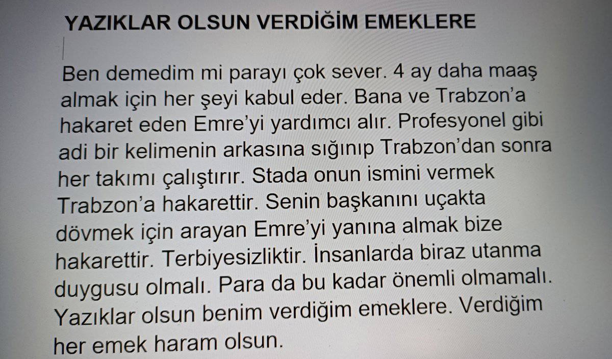 Profesyonel gibi adi bir kelimenin arkasına sığınıp Trabzon’dan sonra her takımı çalıştırır. Stada onun ismini vermek Trabzon’a hakarettir. Senin başkanını uçakta dövmek için arayan Emre’yi yanına almak bize hakarettir. Terbiyesizliktir.