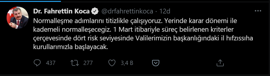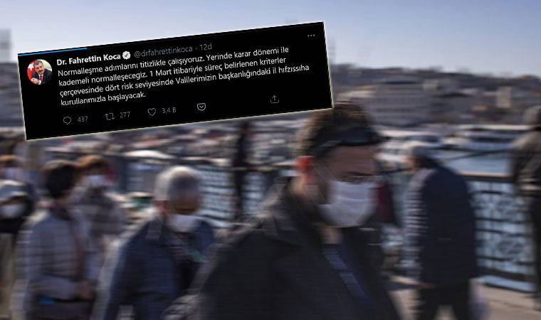 Bakan Koca, Twitter hesabından yaptığı açıklamada, "Normalleşme adımlarını titizlikle çalışıyoruz. Yerinde karar dönemi ile kademeli normalleşecegiz. 1 Mart itibarıyla süreç belirlenen kriterler çerçevesinde 4 risk seviyesinde Valilerimizin başkanlığındaki il hıfzıssıha kurullarımızla başlayacak" ifadelerini kullandı.