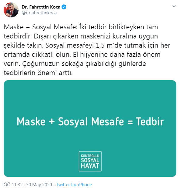 Sağlık Bakanı Fahrettin Koca, Twitter hesabından açıklama yaptı. Bakan Koca, maske ve sosyal mesafenin birlikte uygulandığında tam tedbir olduğuna dikkat çekerek, "Dışarı çıkarken maskenizi kuralına uygun şekilde takın. Sosyal mesafeyi 1,5 metrede tutmak için her ortamda dikkatli olun. El hijyenine daha fazla önem verin. Çoğumuzun sokağa çıkabildiği günlerde tedbirlerin önemi arttı'' ifadelerini kullandı.