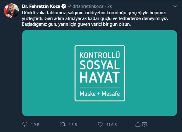 Bakan Koca, sosyal paylaşım sitesi Twitter hesabından yaptığı açıklamada, "Dünkü vaka tablomuz, salgının ciddiyetini koruduğu gerçeğiyle hepimizi yüzleştirdi. Geri adım atmayacak kadar güçlü ve tedbirlerde deneyimliyiz. Başladığımız gün, yarın için güven verici bir gün olsun" ifadesini kullandı. Koca ayrıca, "Kontrollü sosyal hayat, maske + mesafe" ifadesinin yer aldığı fotoğrafı paylaştı.