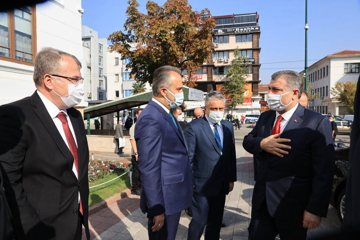 Salgınla mücadelede Bursa ve çevre illerdeki durumla ilgili toplantılar yapmak üzere kente gelen Koca, Heykel semtindeki tarihi Valilik Binası'nda Vali Yakup Canbolat'ı ziyaret etti.