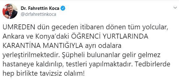 Sağlık Bakanı Koca, umreden dönerek Ankara ve Konya'da karantina altına alınan yurttaşlar hakkında açıklamada bulundu. Koca, "Umreden dün geceden itibaren dönen tüm yolcular, Ankara ve Konya'daki öğrenci yurtlarında karantina mantığıyla ayrı odalara yerleştirilmektedir.Şüpheli bulunanlar gelir gelmez hastaneye kaldırılıp, testleri yapılmaktadır. Tedbirlerde hep birlikte tavizsiz olalım!" dedi.