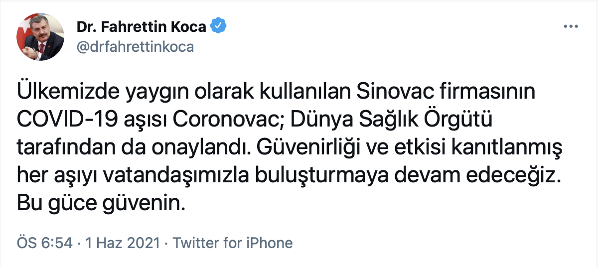 Türkiye'de de uygulanan Sinovac aşısına Dünya Sağlık Örgütü (DSÖ) tarafından acil kullanım onayı verilmesinin ardından Sağlık Bakanı Fahrettin Koca Twitter hesabı üzerinden açıklama yaptı. Koca paylaşımında, "Güvenirliği ve etkisi kanıtlanmış her aşıyı vatandaşımızla buluşturmaya devam edeceğiz. Bu güce güvenin" dedi.