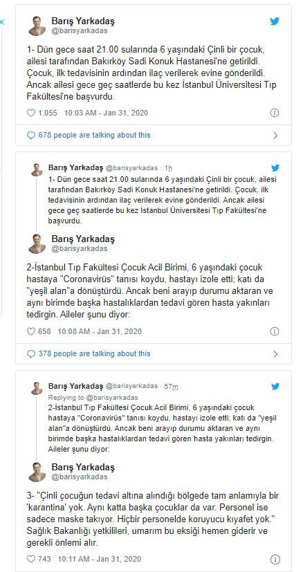Yarkadaş, "Çinli çocuğun tedavi altına alındığı bölgede tam anlamıyla bir 'karantina' yok. Aynı katta başka çocuklar da var. Personel ise sadece maske takıyor" diye yazdı.
