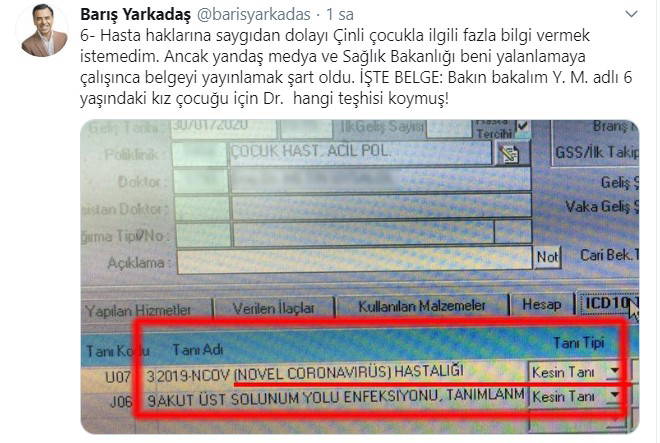 Daha sonra bir açıklama daha yapan Yarkadaş, "Hasta haklarına saygıdan dolayı Çinli çocukla ilgili fazla bilgi vermek istemedim. Ancak yandaş medya ve Sağlık Bakanlığı beni yalanlamaya çalışınca belgeyi yayınlamak şart oldu. İŞTE BELGE: Bakın bakalım Y. M. adlı 6 yaşındaki kız çocuğu için Dr. hangi teşhisi koymuş!" ifadelerini kullandı.