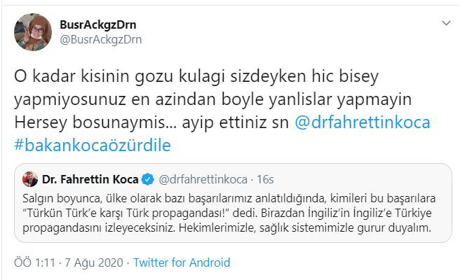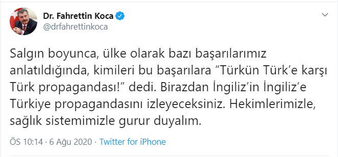 Sağlık Bakanı Fahrettin Koca’nın Twitter hesabından yaptığı “Salgın boyunca, ülke olarak bazı başarılarımız anlatıldığında, kimileri bu başarılara “Türkün Türk’e karşı Türk propagandası!” dedi. Birazdan İngiliz’in İngiliz’e Türkiye propagandasını izleyeceksiniz. Hekimlerimizle, sağlık sistemimizle gurur duyalım” açıklaması üzerine tepki yağdı.