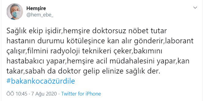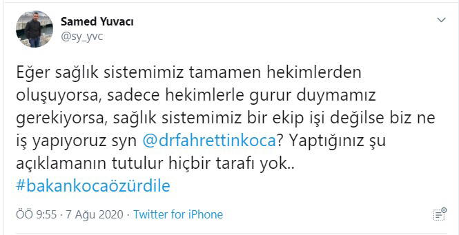 Koca’nın “hekimlerimizle, sağlık sistemimizle gurur duyalım” ifadesinde sadece hekimlere teşekkür ediyorsunuz sağlık çalışanları içerisinde hemşire hasta bakıcı gibi bir çok çalışan var gibi tepkiler geldi. Hekim dışı sağlık çalışanları bu duruma tepki gösterdi.