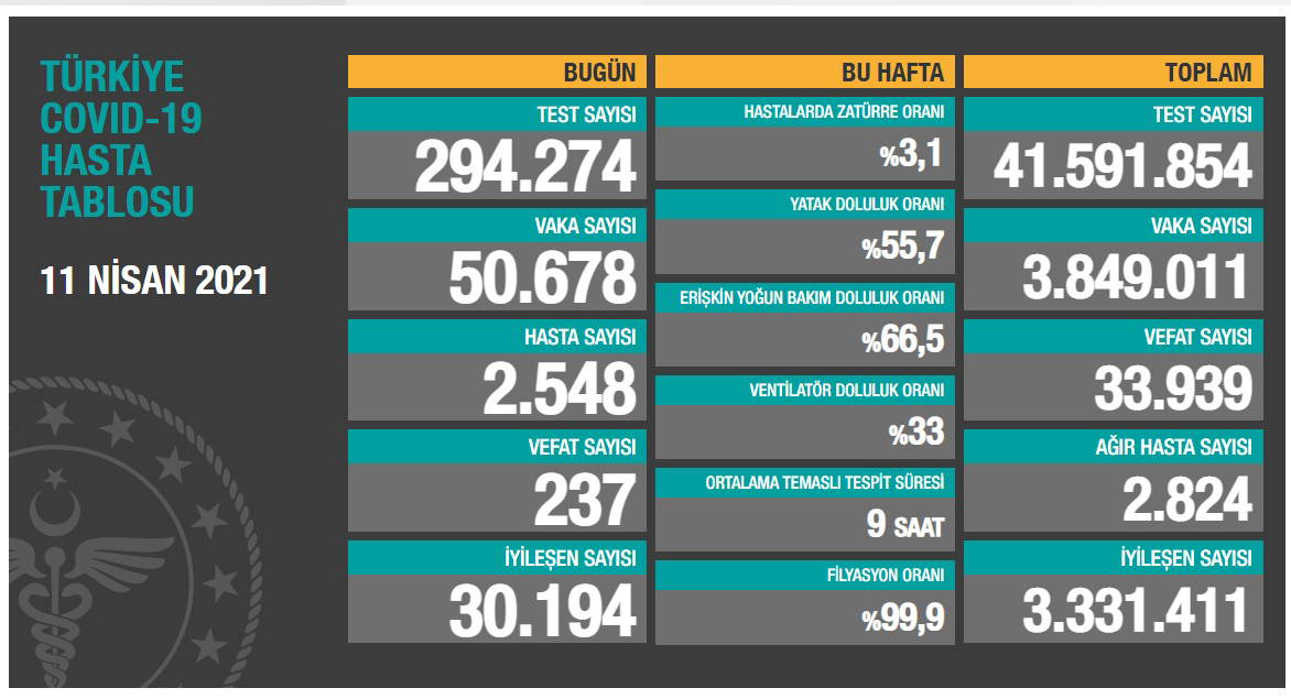 Türkiye'nin 11 Nisan 2021 güncel koronavirüs tablosu şöyle: