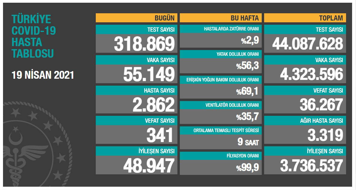 Türkiye'nin 19 Nisan 2021 güncel koronavirüs tablosu şöyle:
