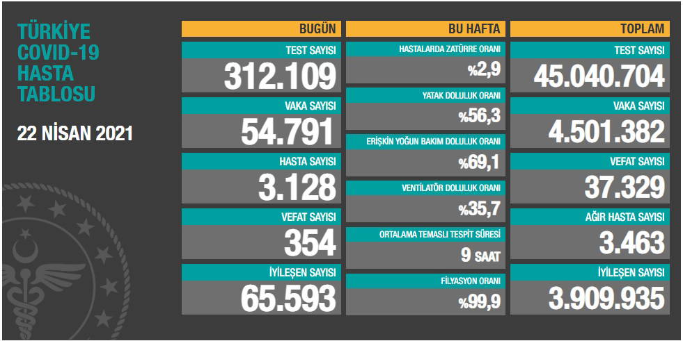 Türkiye'nin 22 Nisan 2021 güncel koronavirüs tablosu şöyle: