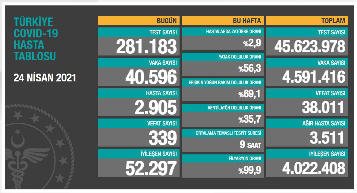 Türkiye'nin 24 Nisan 2021 güncel koronavirüs tablosu şöyle: