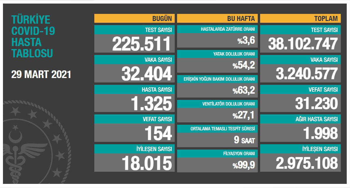 Türkiye'nin 29 Mart 2021 güncel koronavirüs tablosu şöyle: