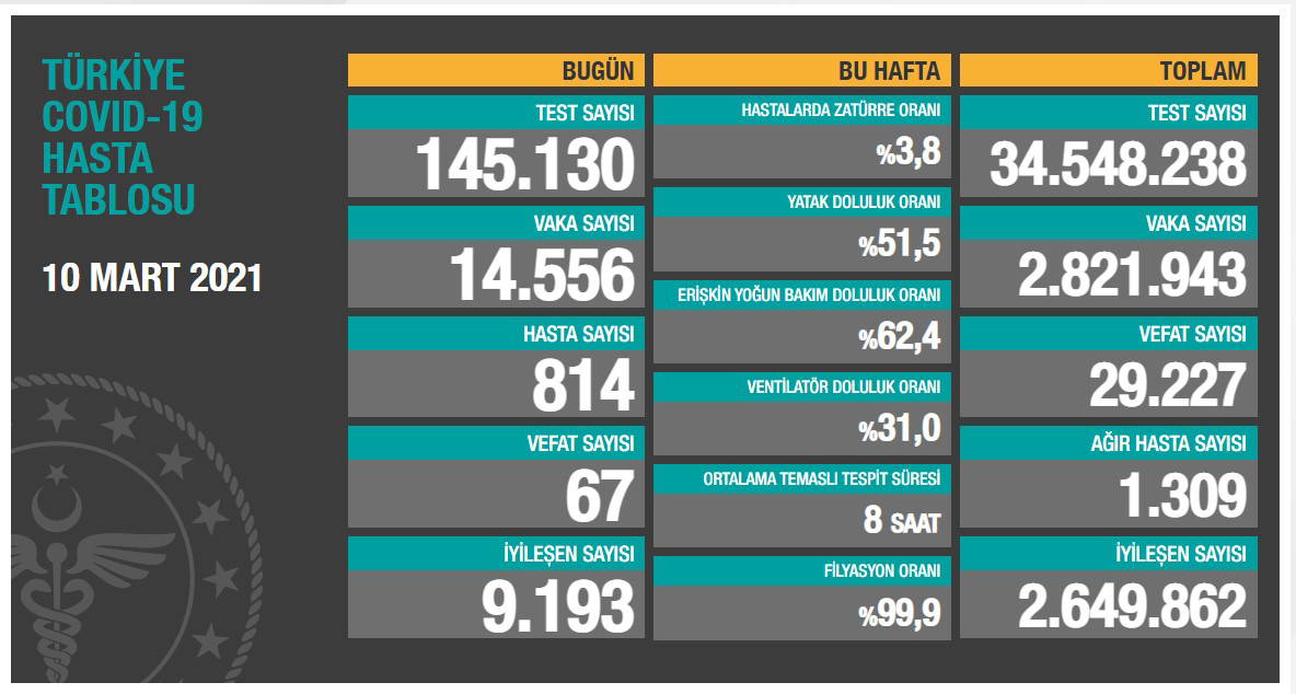 Türkiye'nin 10 Mart 2021 güncel koronavirüs tablosu şöyle: