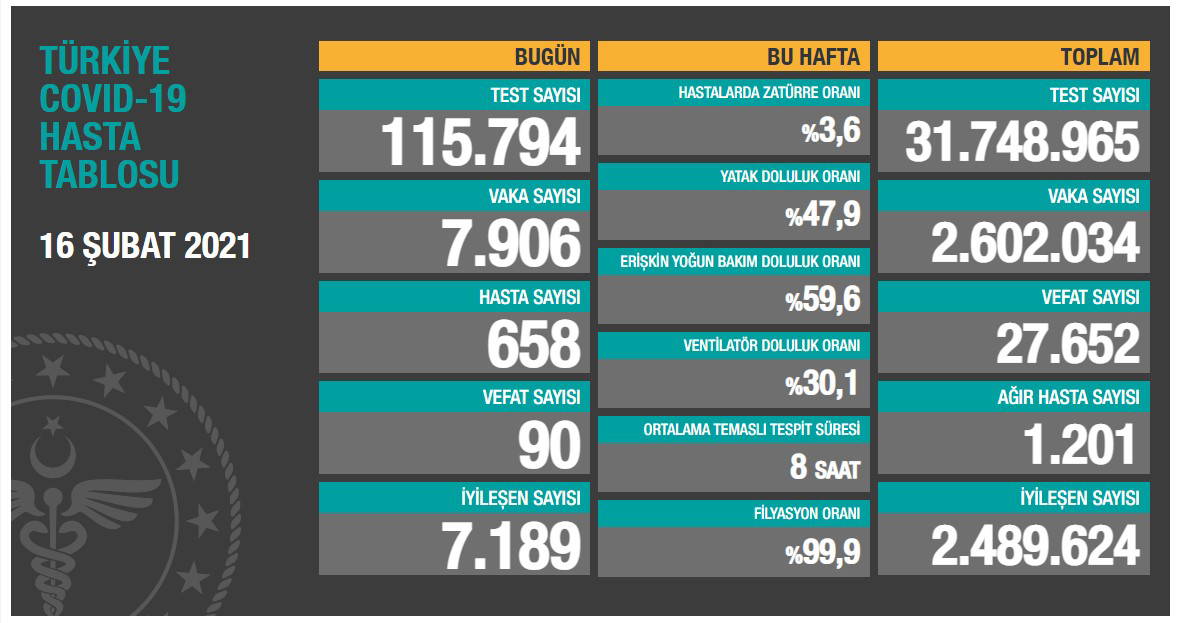 Türkiye'nin 16 Şubat 2021 güncel koronavirüs tablosu şöyle: