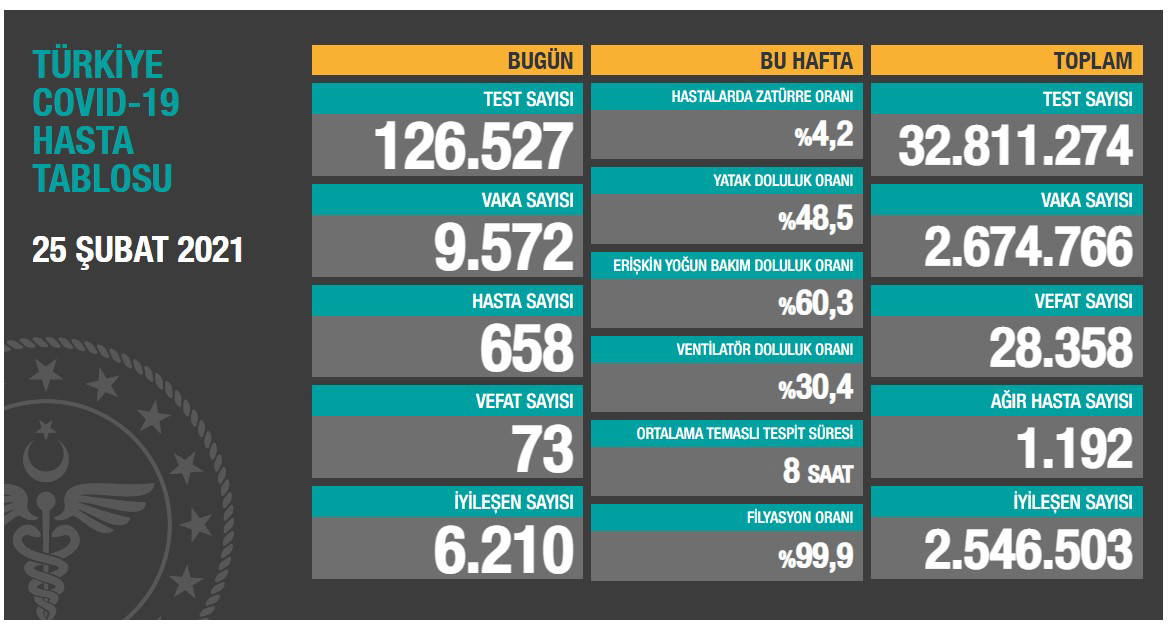 Türkiye'nin 25 Şubat 2021 güncel koronavirüs tablosu şöyle: