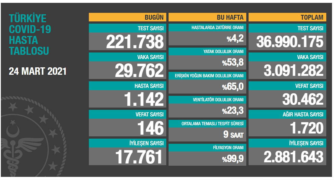 Türkiye'nin 24 Mart 2021 güncel koronavirüs tablosu şöyle: