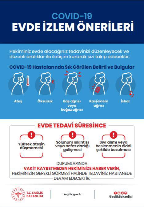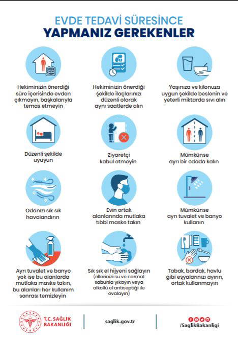 Bakanlık sosyal paylaşım sitesi Twitter'daki hesabından 'Covid-19 Evde İzlem Önerileri Broşürü' yayımladı. Açıklamada, "Covid-19'a yakalandıysanız ve tedavinize evde devam edilecekse hastalığı başkalarına bulaştırmamak için tedaviniz tamamlanana kadar evden çıkmayın. Evinizde mümkünse aile bireylerinden ayrı bir odada kalın" ifadesi yer aldı.