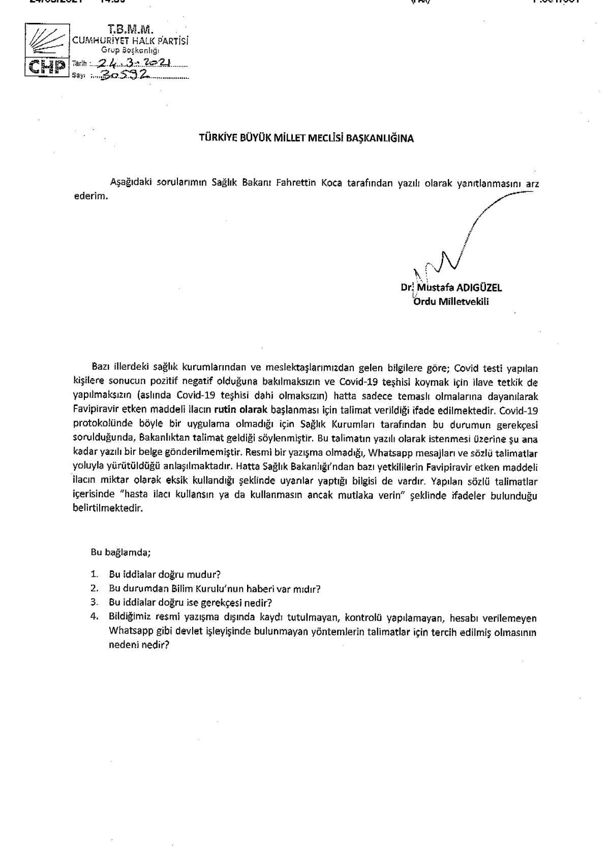 Konuyla ilgili talimatların resmi olmayan yollardan verildiğini aktaran Adızgüzel, Sağlık Bakanı Koca'ya konuya ilişkin soru önergesi yöneltti.